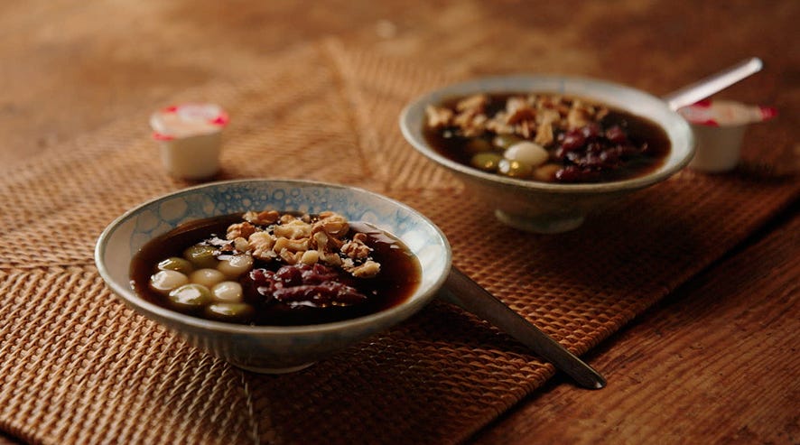I always say that one of my favorite things about Taiwanese traditional desserts is the N U T R I T I O N. This one is made from beans, walnuts, rice, spirulina, and herbal tea, with a little bit of rock sugar.