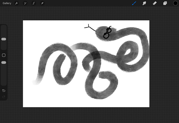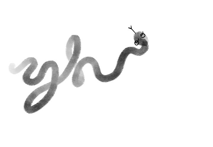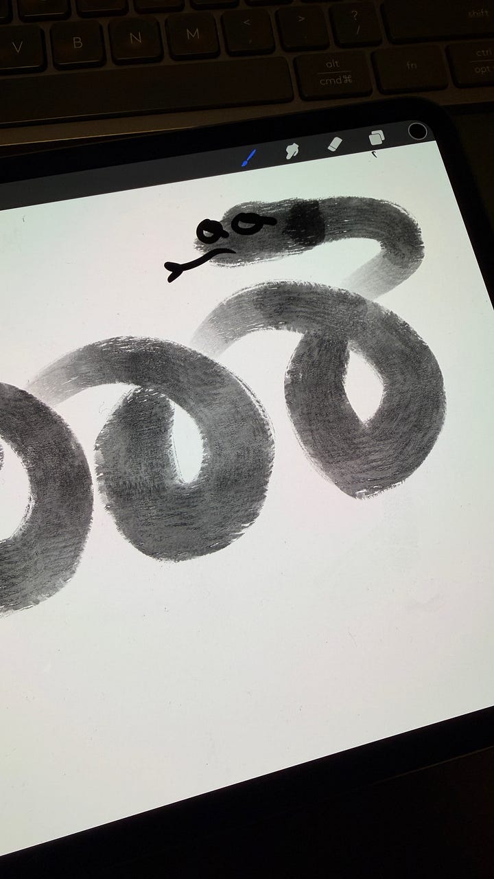 I took from it that a snake was a line in space. Wherever its head has gone, so too its tail. I had a thought about the continuous relationship between past and present, as I drew the zodiac animal in the very end of the snake year. And I thought about how transformation need not be directional, but creeping.