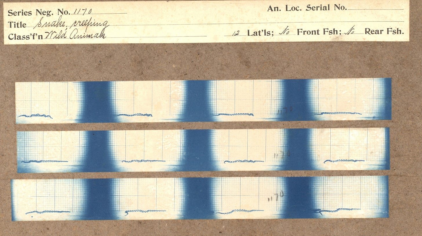 In trying to draw a snake, retroactively, I kept coming into forms that felt defensive (ready to strike), exoticized (sumptuously coiled), or politicized (god forbid I accidentally make a don’t tread on me flag). I looked into Muybridge again, and found that he had also studied the motion of the serpent. Unlike the yang horse, the yin snake is hard to read, a bit arbitrary in its position, and doesn’t seem to have a need to go anywhere at all.