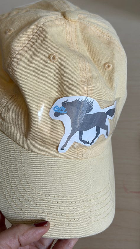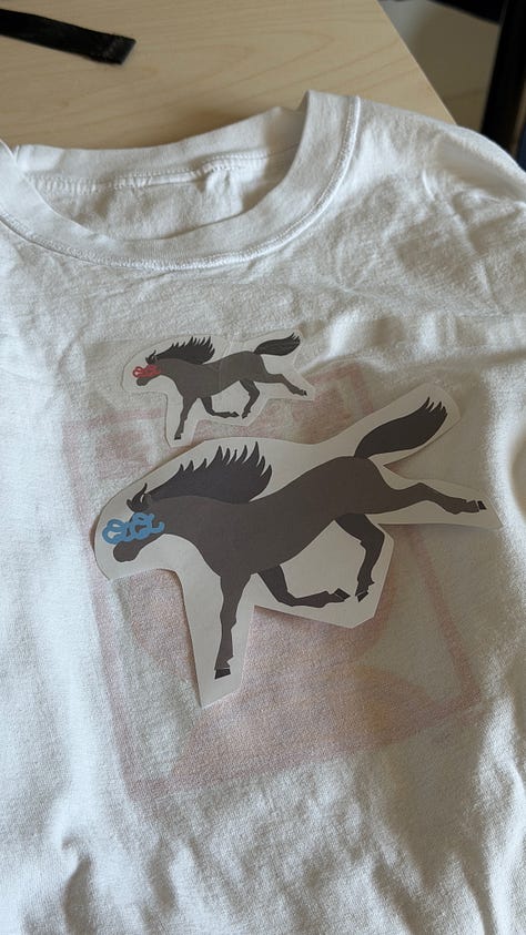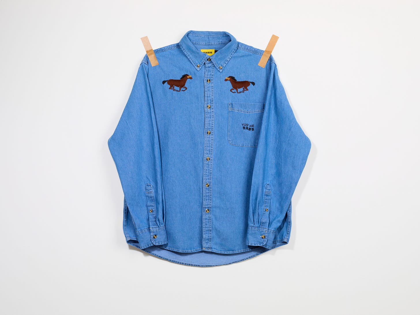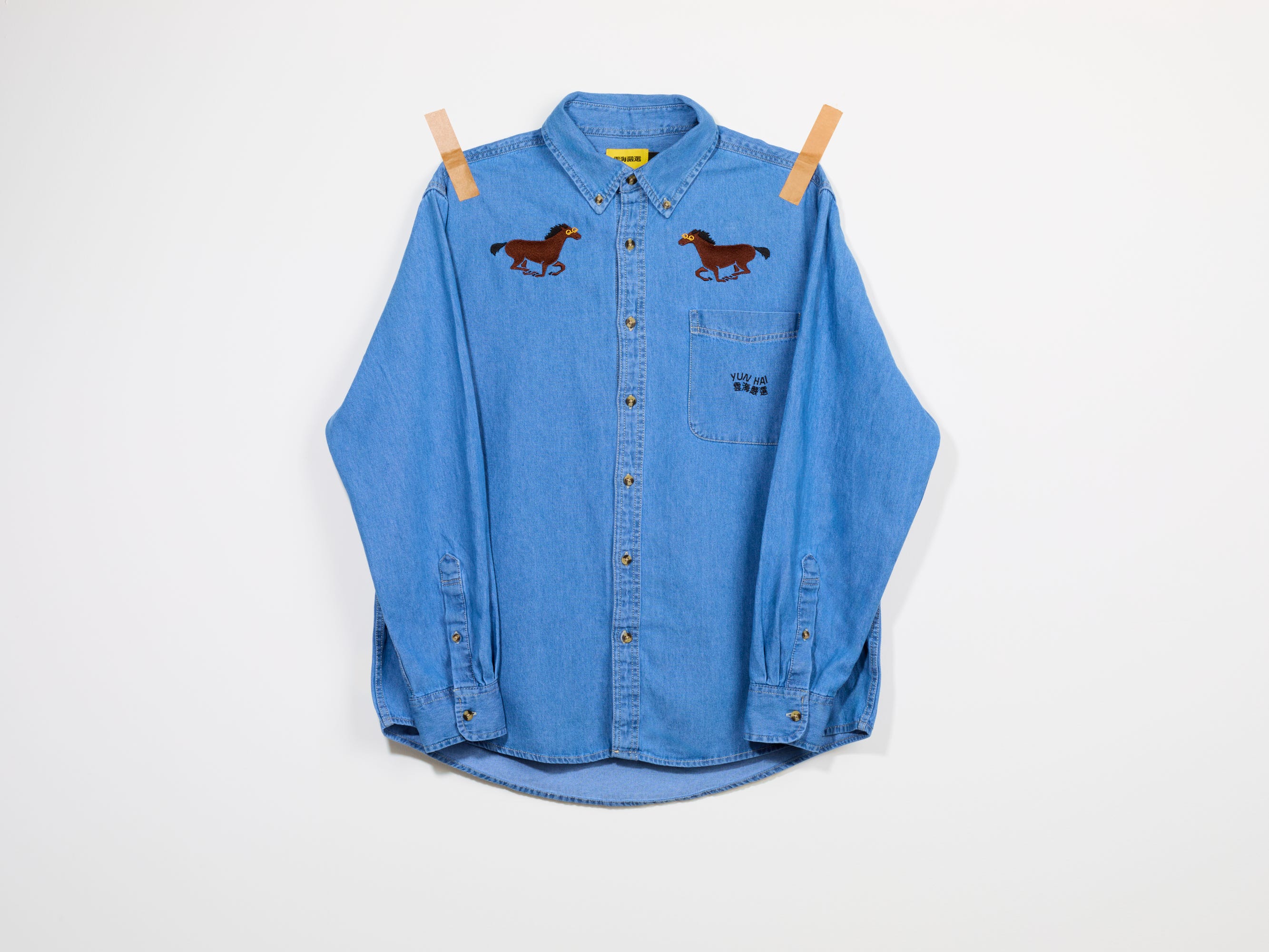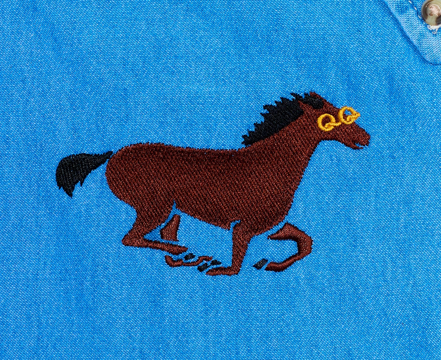 QQ Horse is Kindergarten Horse risen again, shining in postponed glory, adorned only by a pair of glittering, golden glasses. (I happen to be severely myopic and this is also a nod to that whole thing.) She’s embroidered onto a denim shirt, symmetrically mirrored across the centerline, inspired by Western wear and my deep Texan-Taiwanese roots.