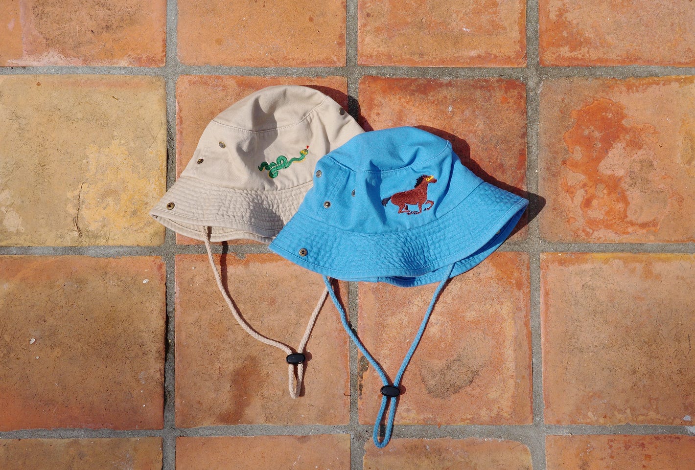 These kids’ safari hats are just what’s needed on an adventure. They’ve got venting grommets up top, buttons on the side to flip up the brim, and an adjustable neck strap. They’re adorned with a zodiac animal on the front and a Yun Hai logo on the back.