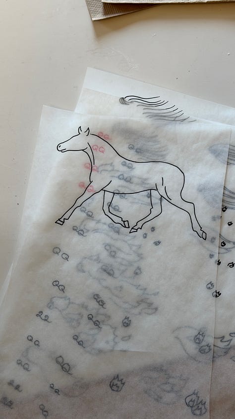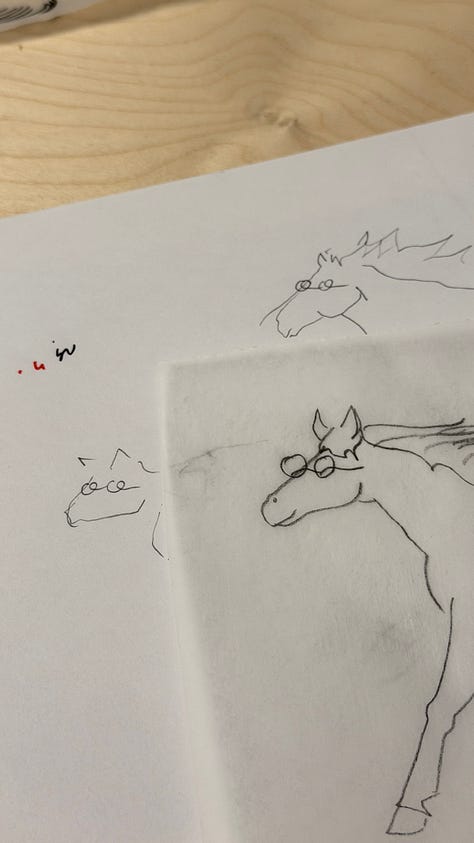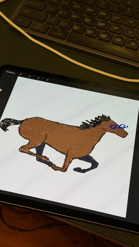 I struggled to draw QQ Horse this year (I struggle every year), and tried to avoid the barbie horse tropes of big hair and plastic-like body. As I worked, I thought of Eadweard Muybridge, who birthed a form of early cinema when trying to understand the mechanics of the horse’s movement. He set up a series of cameras with tripwire shutters and captured a horse at a gallop.