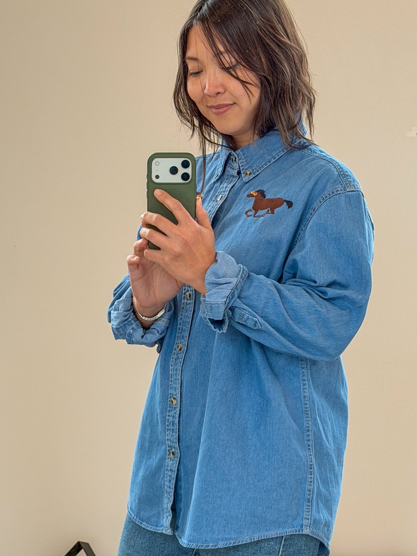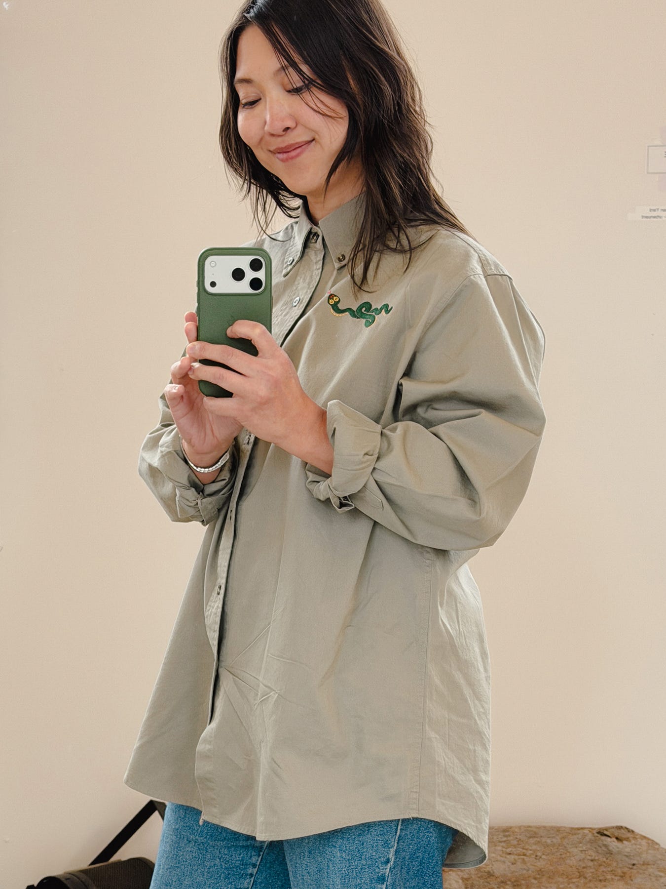 I love a good oversized workshirt—I have at least 25 in my closet, either inherited from my dad or picked up at a thrift store in the image of him. I love to wear a size L and roll the sleeves up. It’s my uniform. Mirror selfie for fit reference, I’m 5’4.”