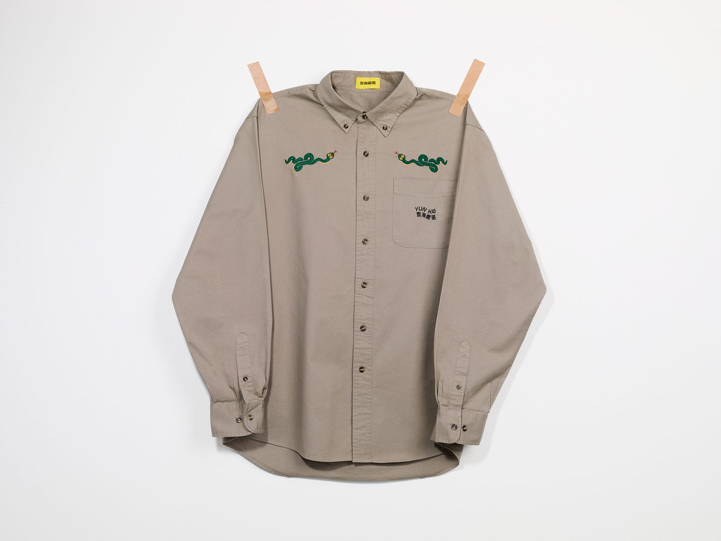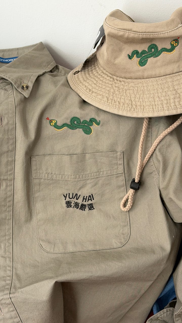 These button-down work shirts have a 90s cut. Two zodiac animals are mirrored across the centerline, embroidered on the yoke of the garment, channeling a western wear aesthetic and calling back to Lisa Cheng Smith’s Texas roots, an important hotbed of Taiwanese activism back in the day!