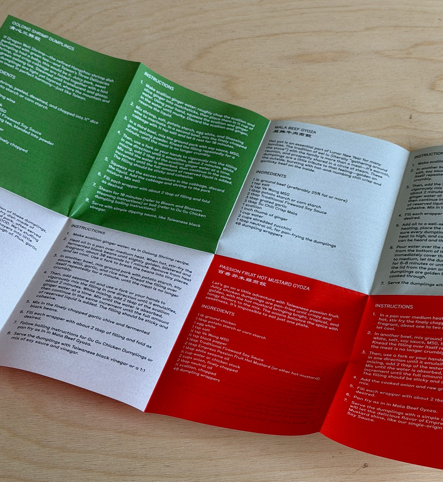 When I told Tiffany about this idea, she graciously agreed to develop the recipes for us as a way to kick off her new dumpling course with a bang (or a fold?). Our role was to design the publication and cover the printing. It’s a win-win!