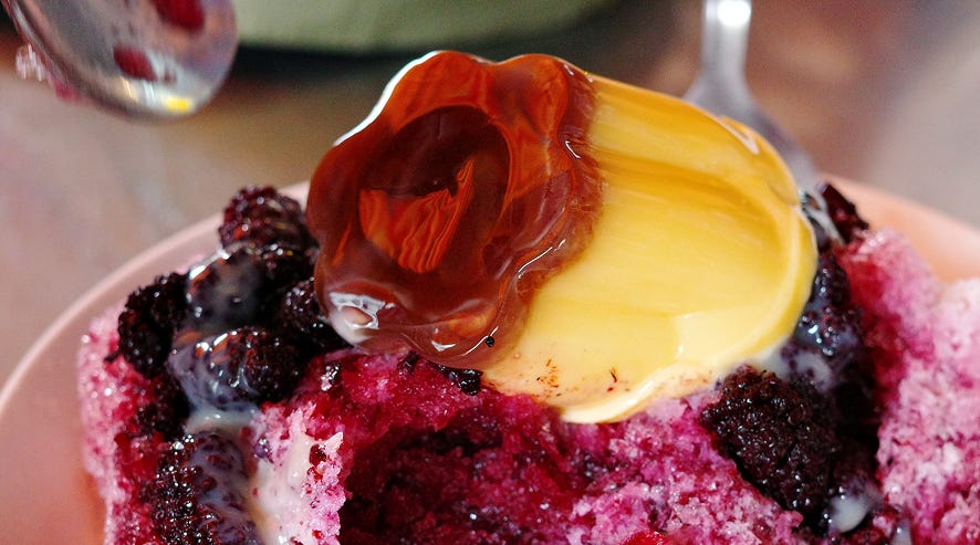 And of course, there’s also the shaved ice option. Top a pile of fluffy ice with a couple spoonfuls of our mulberry jam and a handful of dried berries for texture. Simulate the star fruit element with a bit of lemon zest and flaky salt, drizzle on the condensed milk, and add the flan if you want. If I ever open that Taiwanese diner of my dreams, this will be on the menu as an homage.