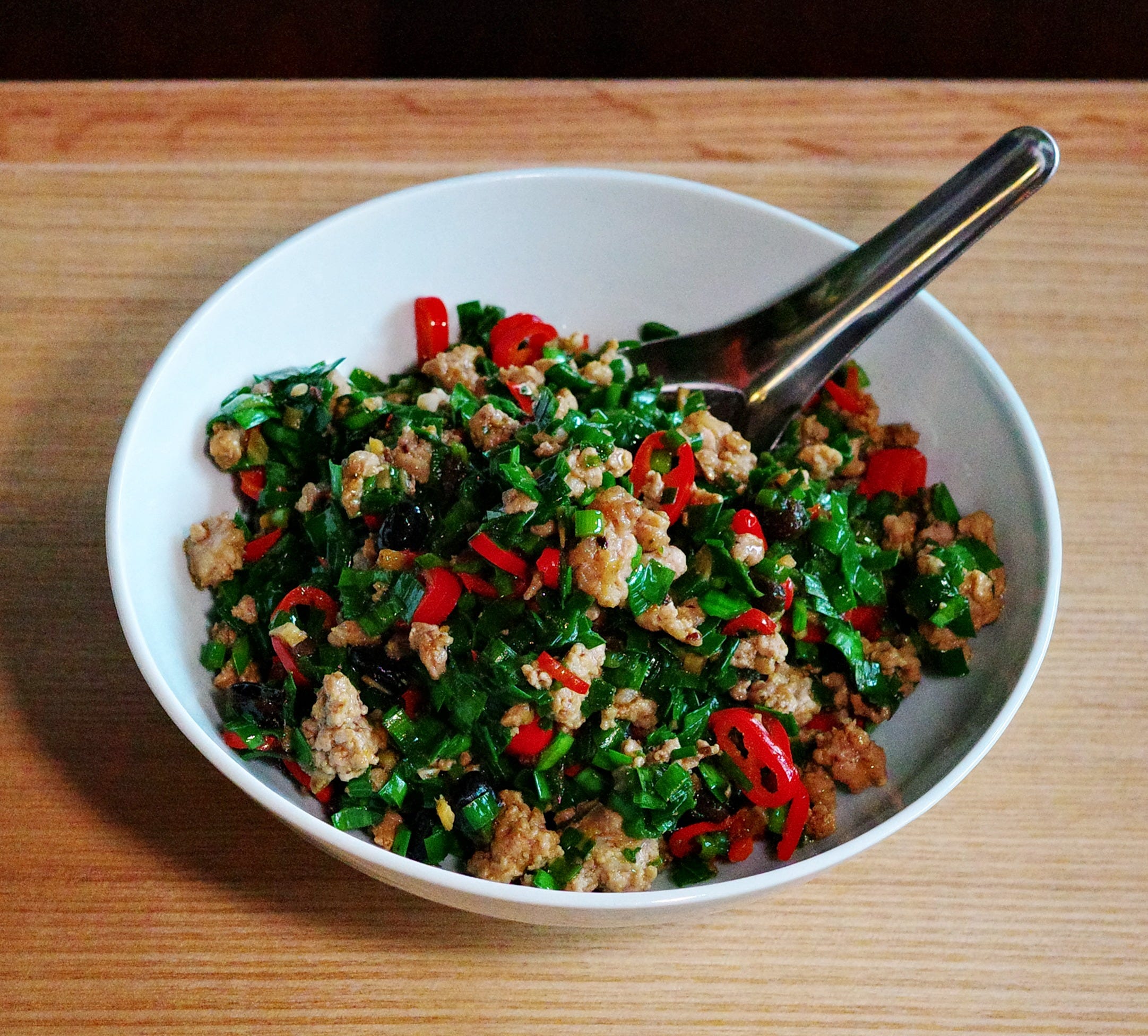No insects were harmed in the making of this dish; a large number of fermented black beans serve as their stunt double. This dish takes a little bit of pork, a whole lot of chives, a palmful of FBB, and as few or as many red chili peppers as you like—and transforms them into a pulse-quickening, hash-like dish best eaten with lots of rice. A Taiwanese homestyle favorite. My tip: go 1:1 on the chives and pork by weight, and use a cold-pressed peanut oil to warm up the whole dish.