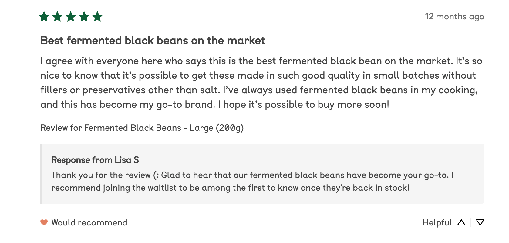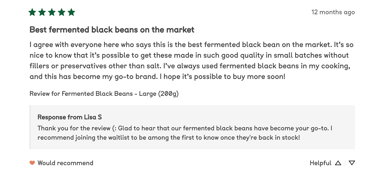 Since then, the fermented black beans have been consistently well reviewed, tend to sell out, and we absolutely adore them. I am not one to speak in superlative, but I do think they’re the best out there. Others agree: