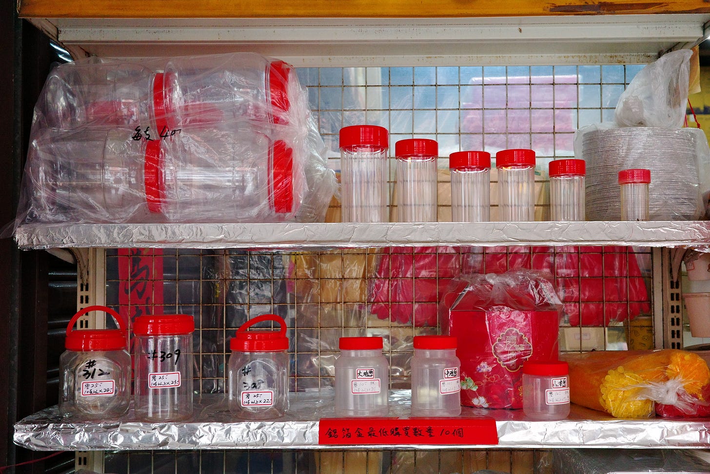 Of course, I looked no further than the daily life shops of Taiwan, where packaging is abundant and also abundantly recycled. I’ve long loved the red topped jars and bottles found in herbal and medicine shops. They’re inexpensive, lightweight, easy to fill, easy to get, available in many sizes, and are so beautiful, with the refractive effect of reeded glass captured in its faceted shape.